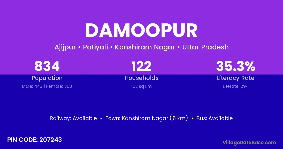 Kanshiram Nagar (6 km) is the nearest town to Damoopur village for major economic activities and is located approximately 6 km away.