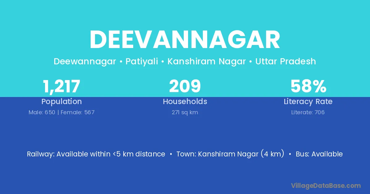 Kanshiram Nagar (4 km) is the nearest town to Deevannagar village for major economic activities and is located approximately 4 km away.