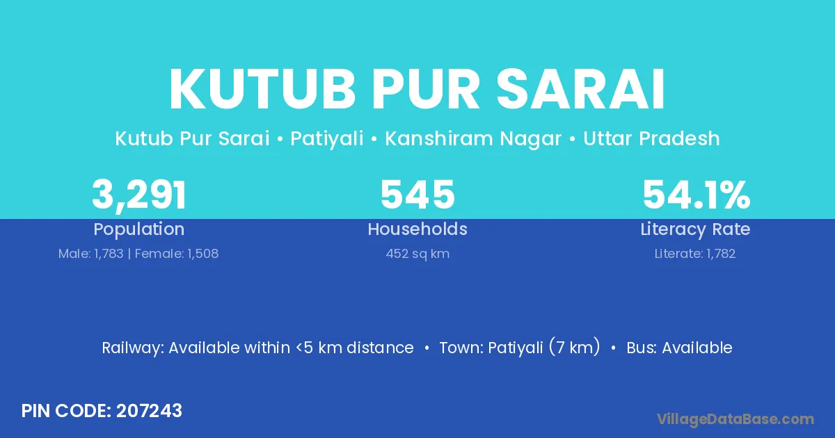 Patiyali (7 km) is the nearest town to Kutub Pur Sarai village for major economic activities and is located approximately 7 km away.