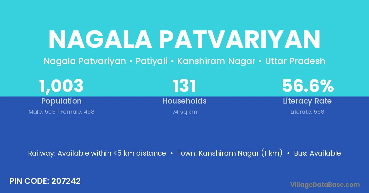Nagala Patvariyan village has a total population of 1,003 people, of which 505 are males and 498 are females.