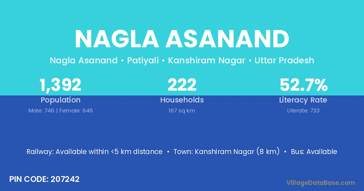 Kanshiram Nagar (8 km) is the nearest town to Nagla Asanand village for major economic activities and is located approximately 8 km away.