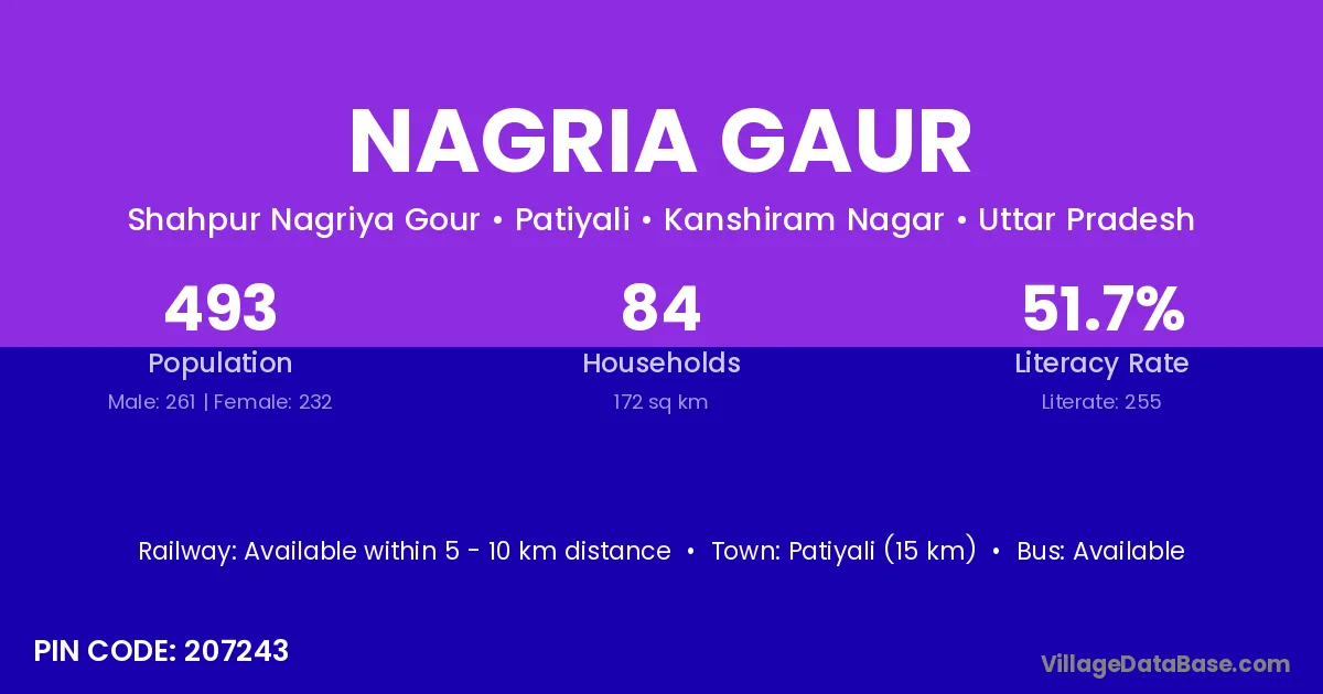 Patiyali (15 km) is the nearest town to Nagria Gaur village for major economic activities and is located approximately 15 km away.