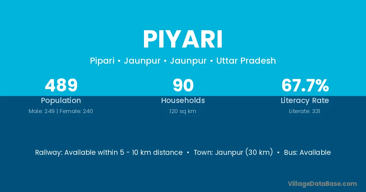 The literacy rate of Piyari village is 44.13%. Male literacy stands at 44.32% and female literacy at 43.88%.