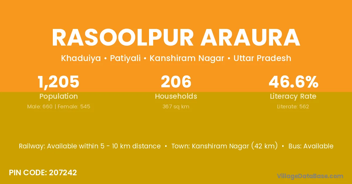 Kanshiram Nagar (42 km) is the nearest town to Rasoolpur Araura village for major economic activities and is located approximately 42 km away.