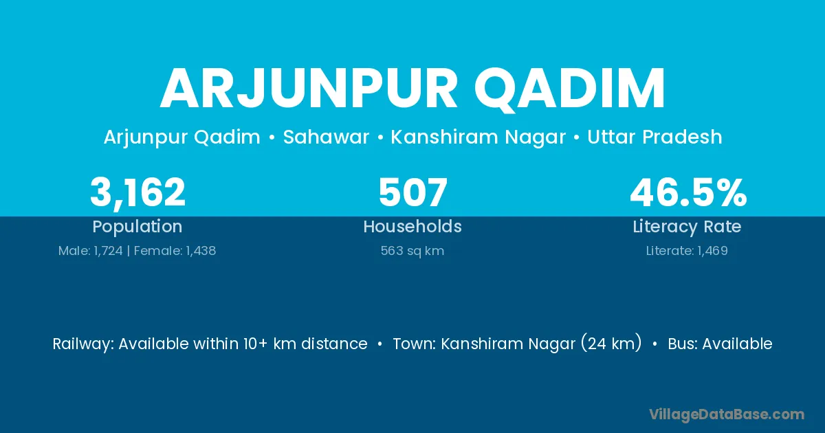 Kanshiram Nagar (24 km) is the nearest town to Arjunpur Qadim village for major economic activities and is located approximately 24 km away.