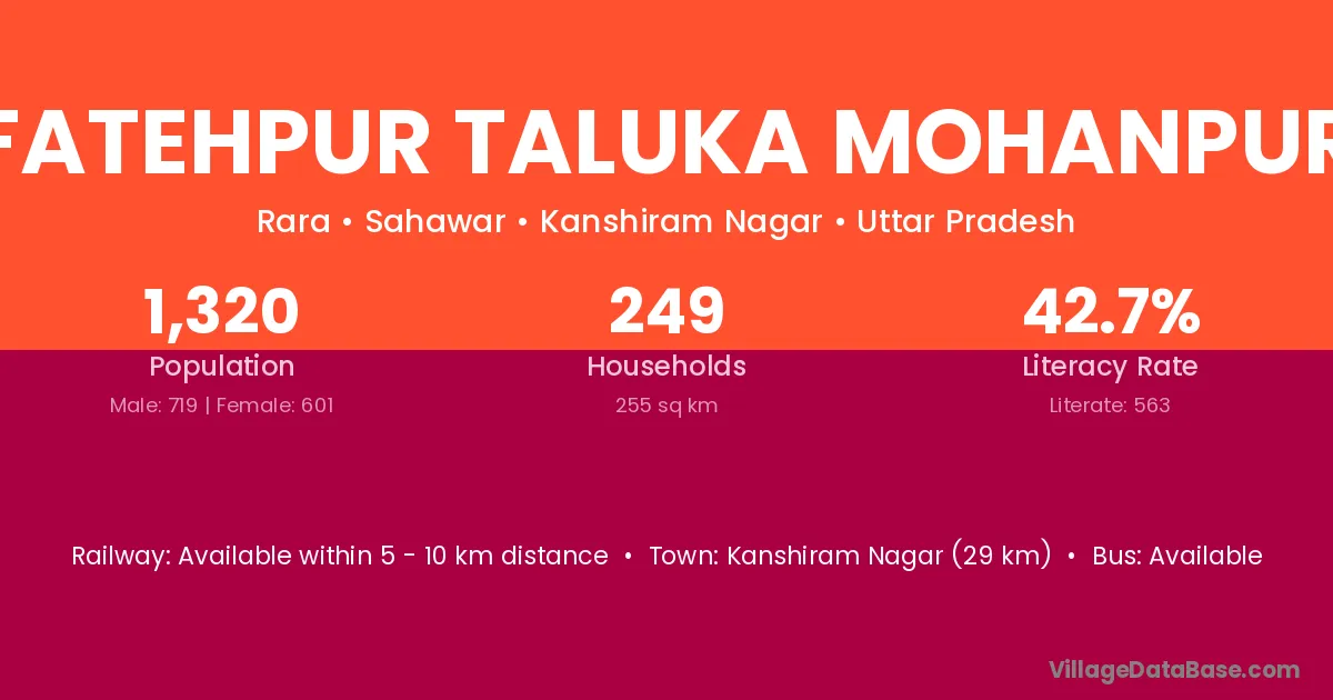 Kanshiram Nagar (29 km) is the nearest town to Fatehpur Taluka Mohanpur village for major economic activities and is located approximately 29 km away.