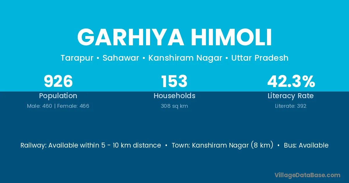 Kanshiram Nagar (8 km) is the nearest town to Garhiya Himoli village for major economic activities and is located approximately 8 km away.