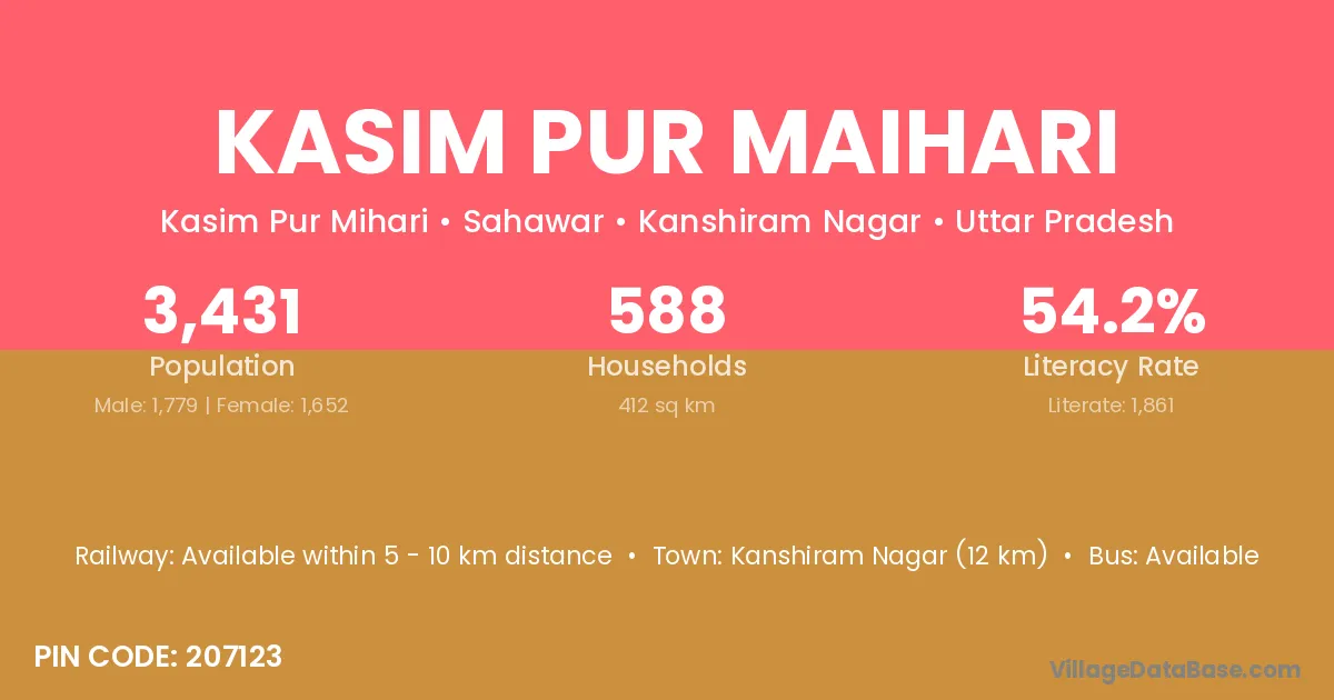 Kanshiram Nagar (12 km) is the nearest town to Kasim Pur Maihari village for major economic activities and is located approximately 12 km away.