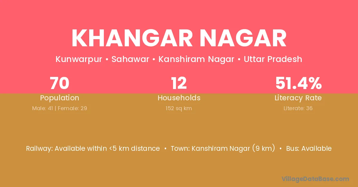 Kanshiram Nagar (9 km) is the nearest town to Khangar Nagar village for major economic activities and is located approximately 9 km away.