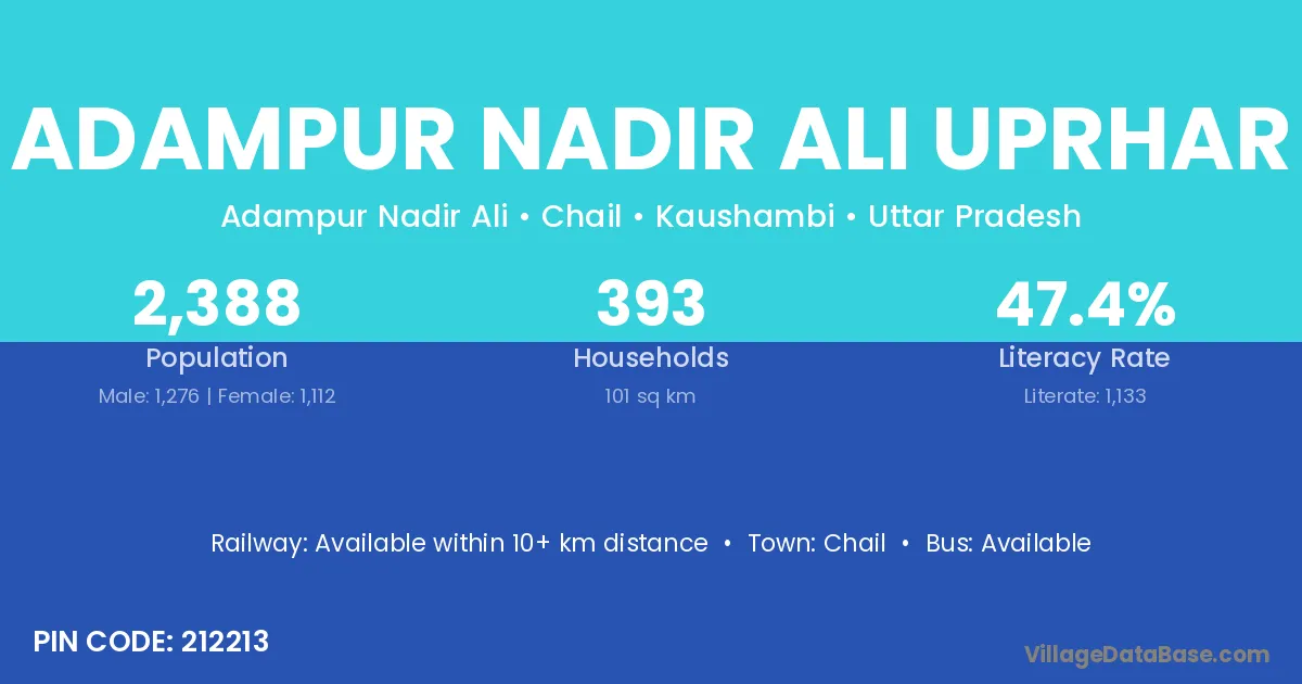 Adampur Nadir Ali Uprhar village has a total population of 2,388 people, of which 1,276 are males and 1,112 are females.