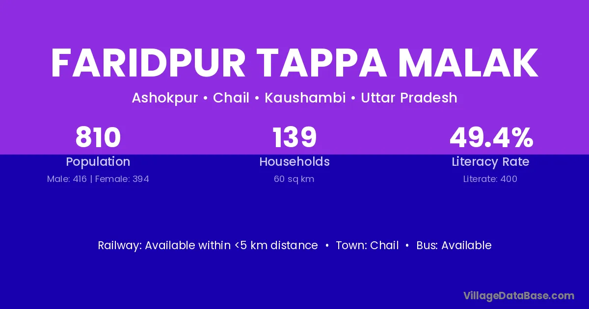 Faridpur Tappa Malak village has a total population of 810 people, of which 416 are males and 394 are females.