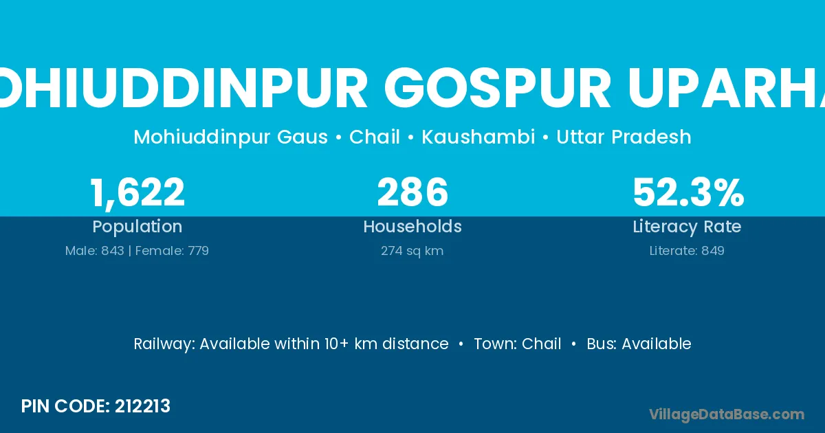 Mohiuddinpur Gospur Uparhar village has a total population of 1,622 people, of which 843 are males and 779 are females.