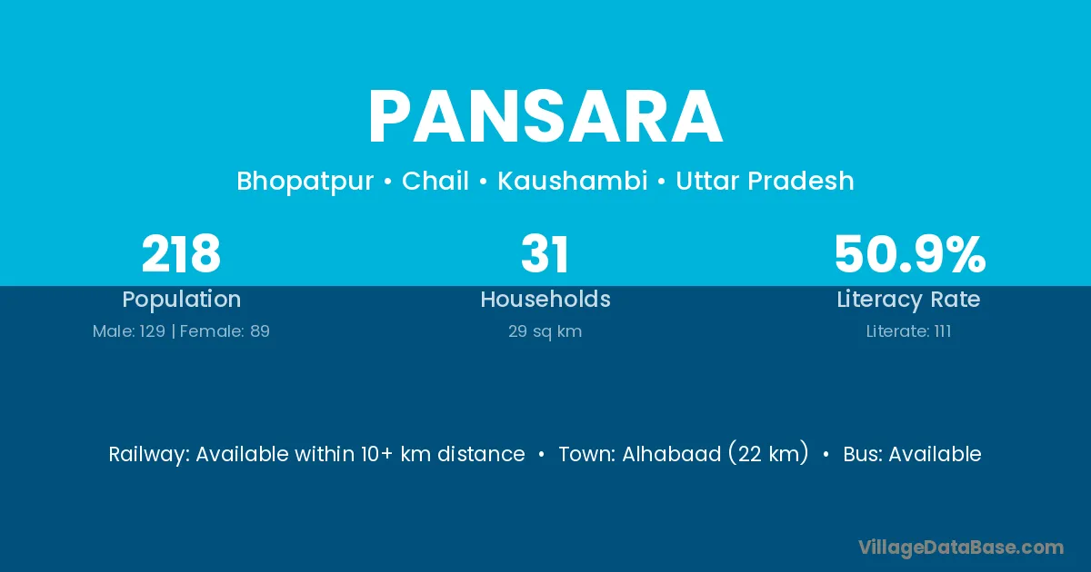 Pansara village has a total population of 218 people, of which 129 are males and 89 are females.