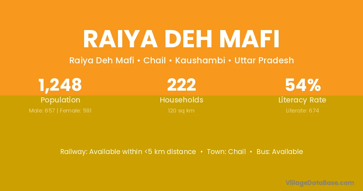 Raiya Deh Mafi village has a total population of 1,248 people, of which 657 are males and 591 are females.