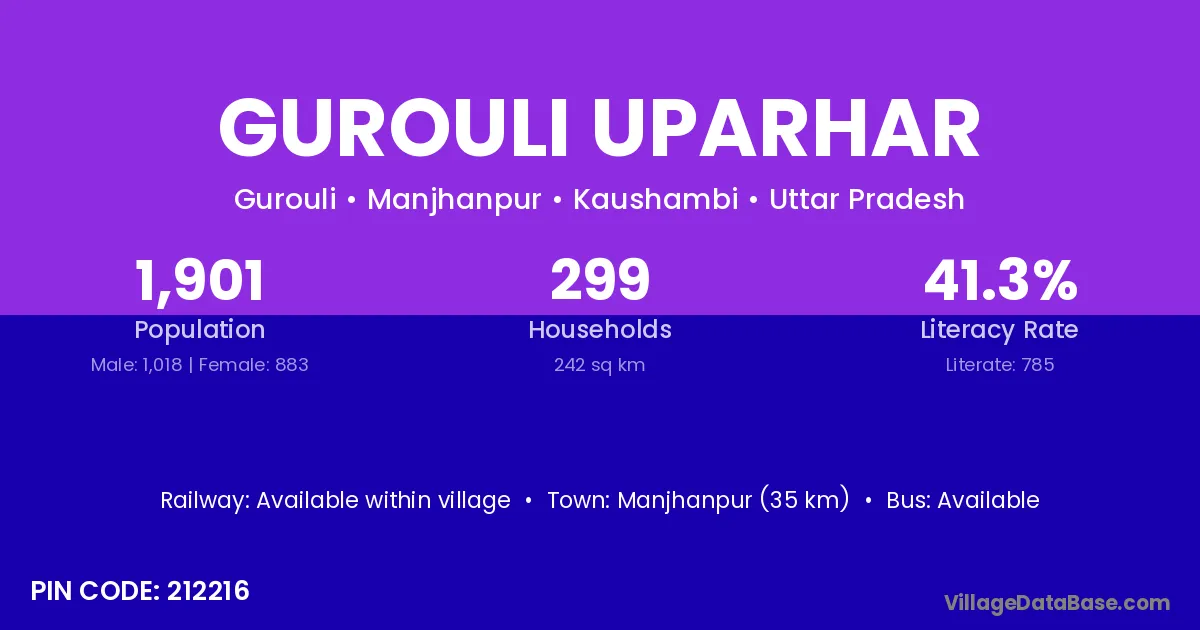 Manjhanpur (35 km) is the nearest town to Gurouli Uparhar village for major economic activities and is located approximately 35 km away.