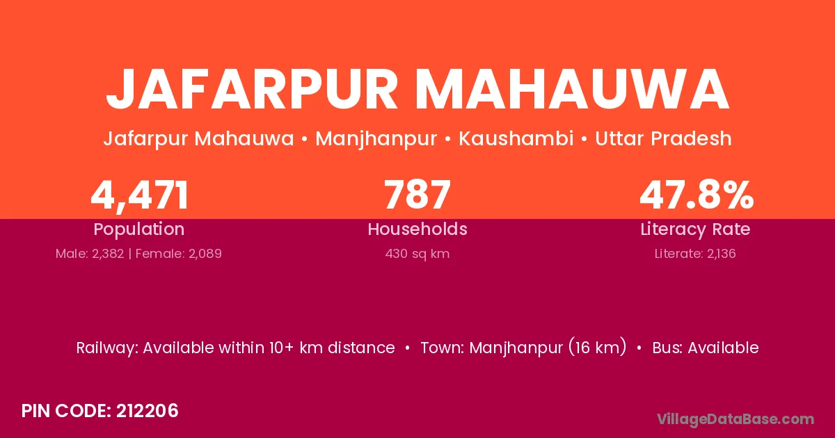 Manjhanpur (16 km) is the nearest town to Jafarpur Mahauwa village for major economic activities and is located approximately 16 km away.