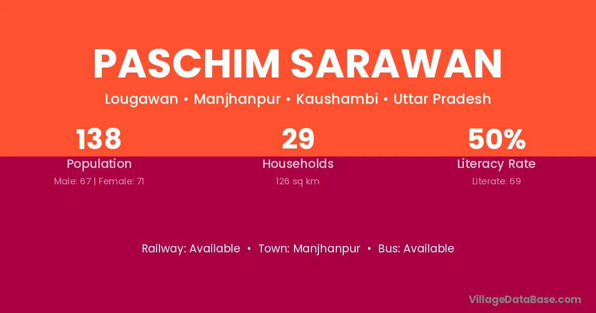 Paschim Sarawan village has a total population of 138 people, of which 67 are males and 71 are females.