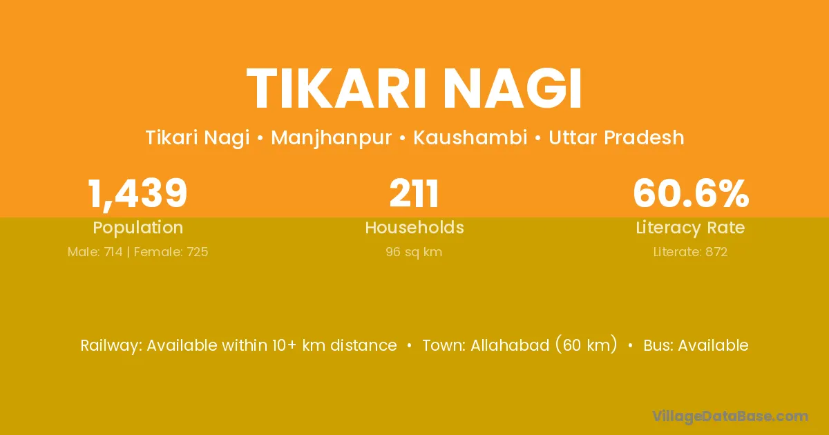 Allahabad (60 km) is the nearest town to Tikari Nagi village for major economic activities and is located approximately 60 km away.