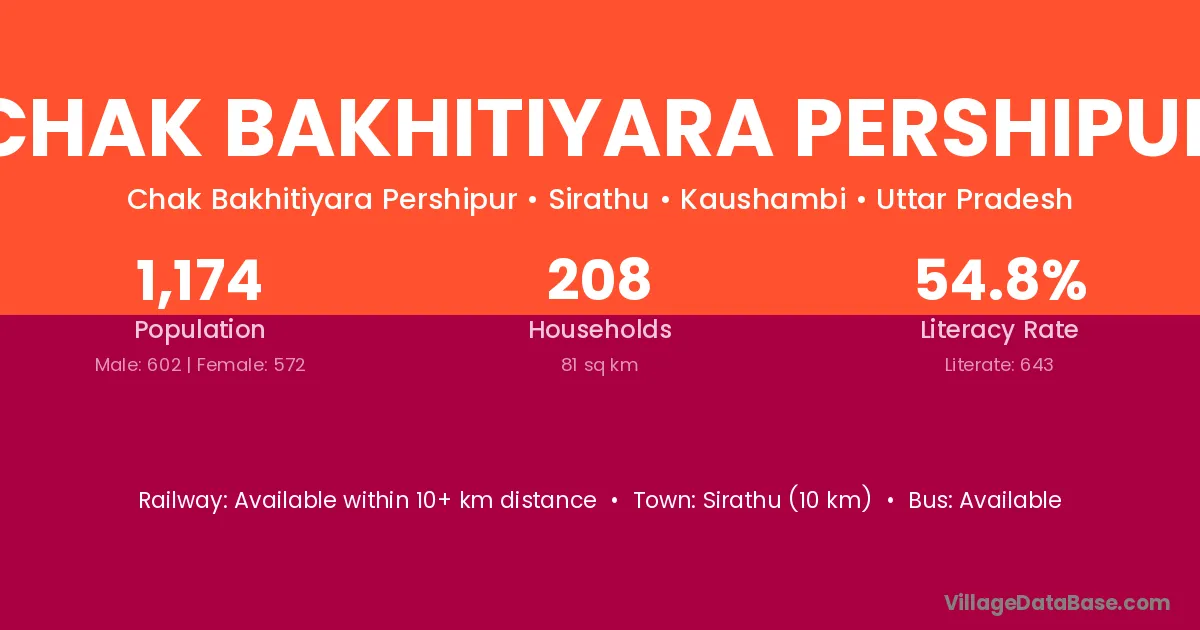Chak Bakhitiyara Pershipur village has a total population of 1,174 people, of which 602 are males and 572 are females.