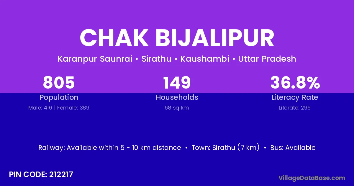 Chak Bijalipur village has a total population of 805 people, of which 416 are males and 389 are females.