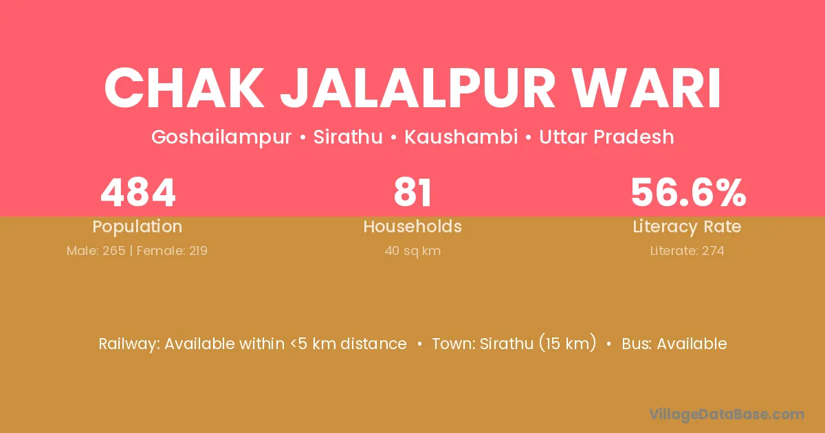 Sirathu (15 km) is the nearest town to Chak Jalalpur Wari village for major economic activities and is located approximately 15 km away.