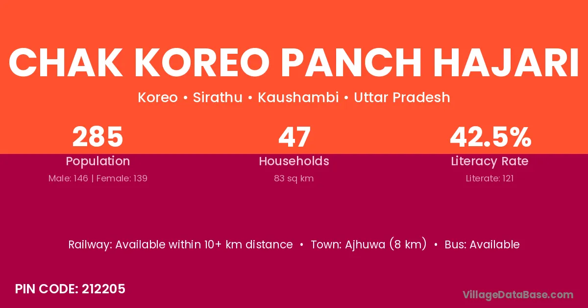 Chak Koreo Panch Hajari village has a total population of 285 people, of which 146 are males and 139 are females.