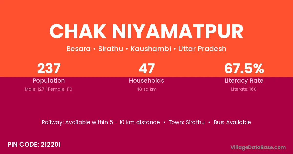 Chak Niyamatpur village has a total population of 237 people, of which 127 are males and 110 are females.