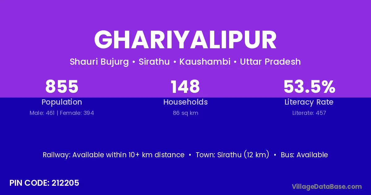 Sirathu (12 km) is the nearest town to Ghariyalipur village for major economic activities and is located approximately 12 km away.