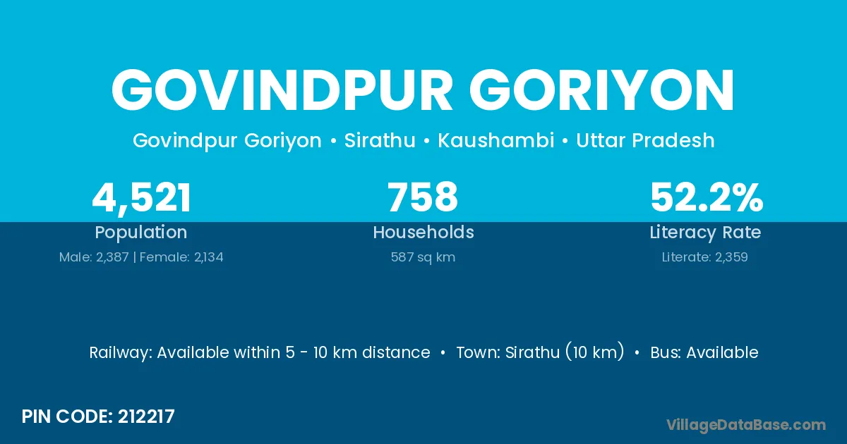 Sirathu (10 km) is the nearest town to Govindpur Goriyon village for major economic activities and is located approximately 10 km away.