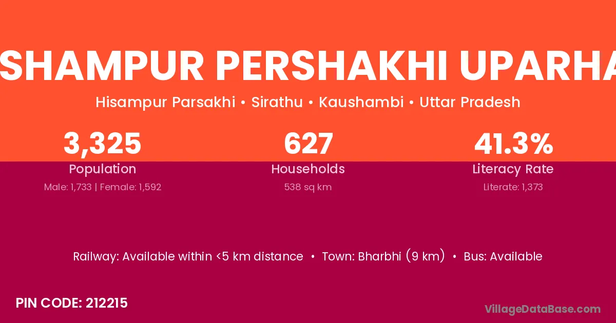 Bharbhi (9 km) is the nearest town to Hishampur Pershakhi Uparhar village for major economic activities and is located approximately 9 km away.