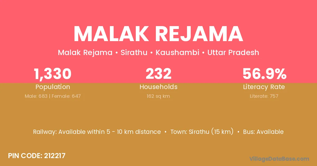 Sirathu (15 km) is the nearest town to Malak Rejama village for major economic activities and is located approximately 15 km away.