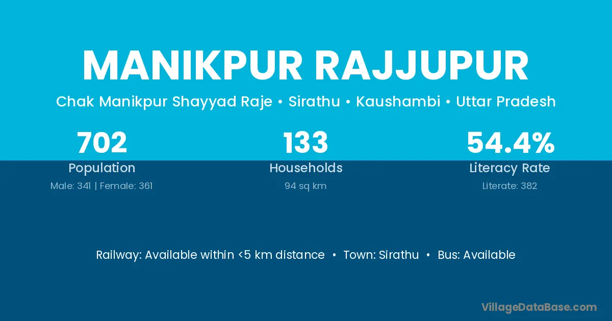 Manikpur Rajjupur village has a total population of 702 people, of which 341 are males and 361 are females.
