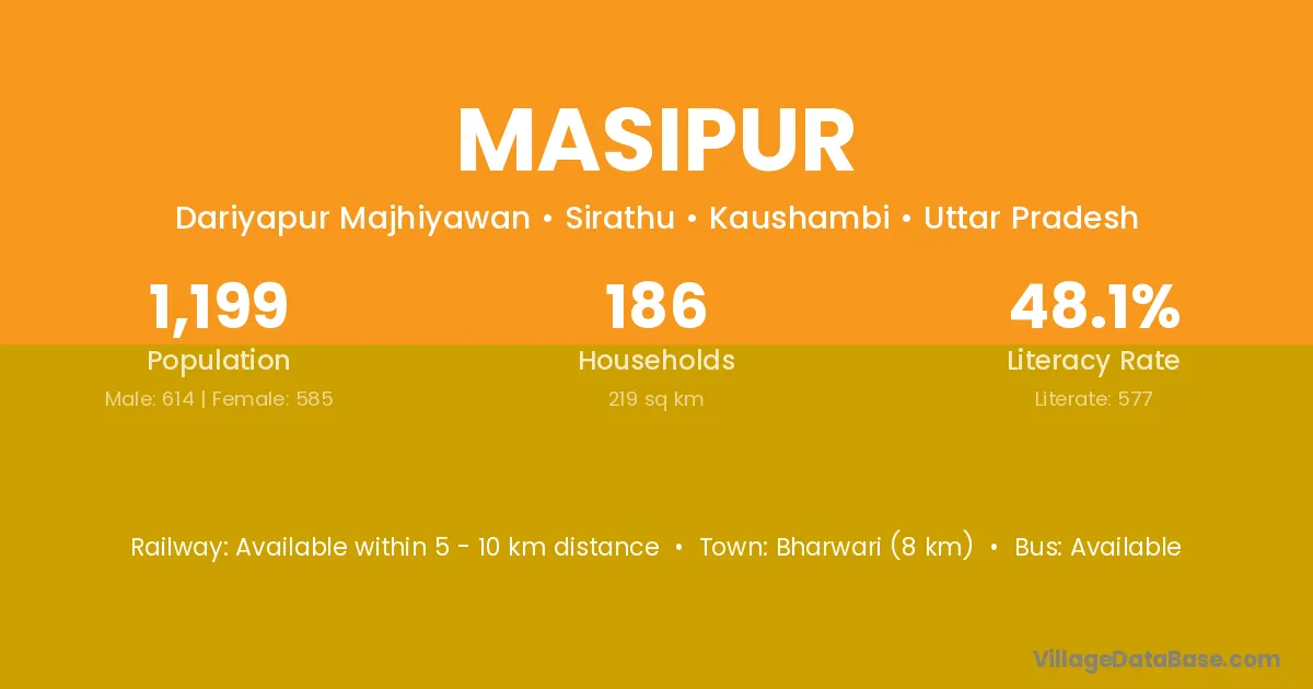 Bharwari (8 km) is the nearest town to Masipur village for major economic activities and is located approximately 8 km away.
