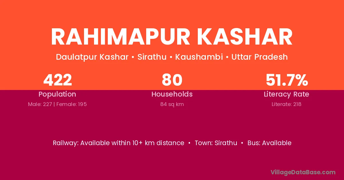 Rahimapur Kashar village has a total population of 422 people, of which 227 are males and 195 are females.