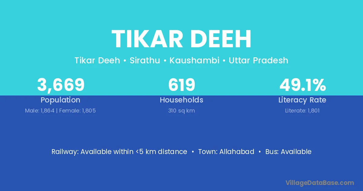 Tikar Deeh village has a total population of 3,669 people, of which 1,864 are males and 1,805 are females.