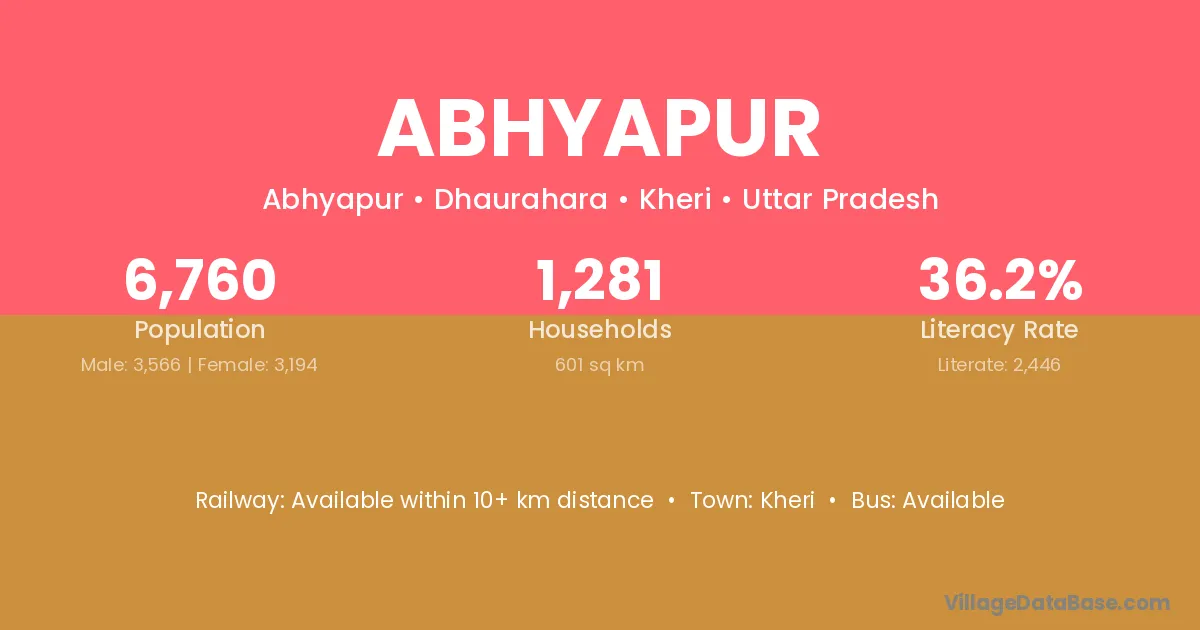 Abhyapur village has a total population of 6,760 people, of which 3,566 are males and 3,194 are females.