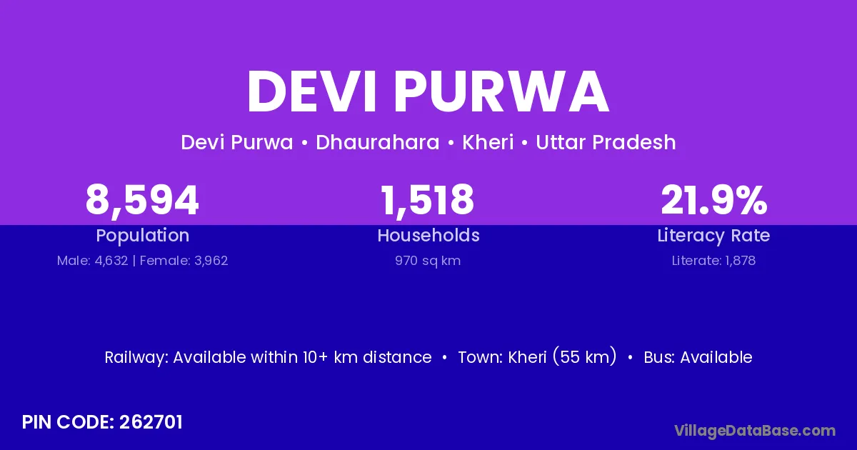 Kheri (55 km) is the nearest town to Devi Purwa village for major economic activities and is located approximately 55 km away.