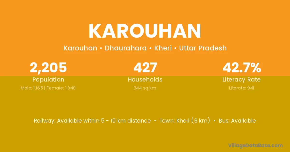 Karouhan village has a total population of 2,205 people, of which 1,165 are males and 1,040 are females.