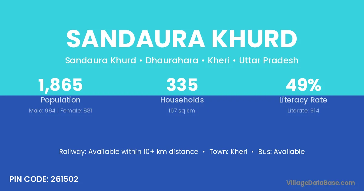 Sandaura Khurd village has a total population of 1,865 people, of which 984 are males and 881 are females.