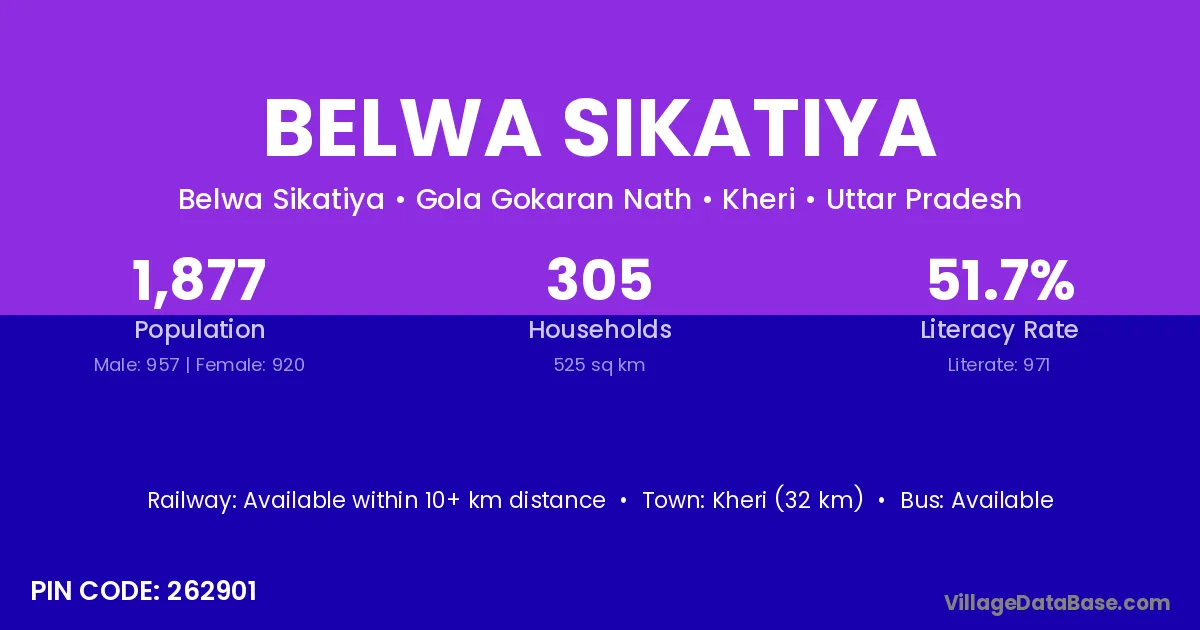 Kheri (32 km) is the nearest town to Belwa Sikatiya village for major economic activities and is located approximately 32 km away.