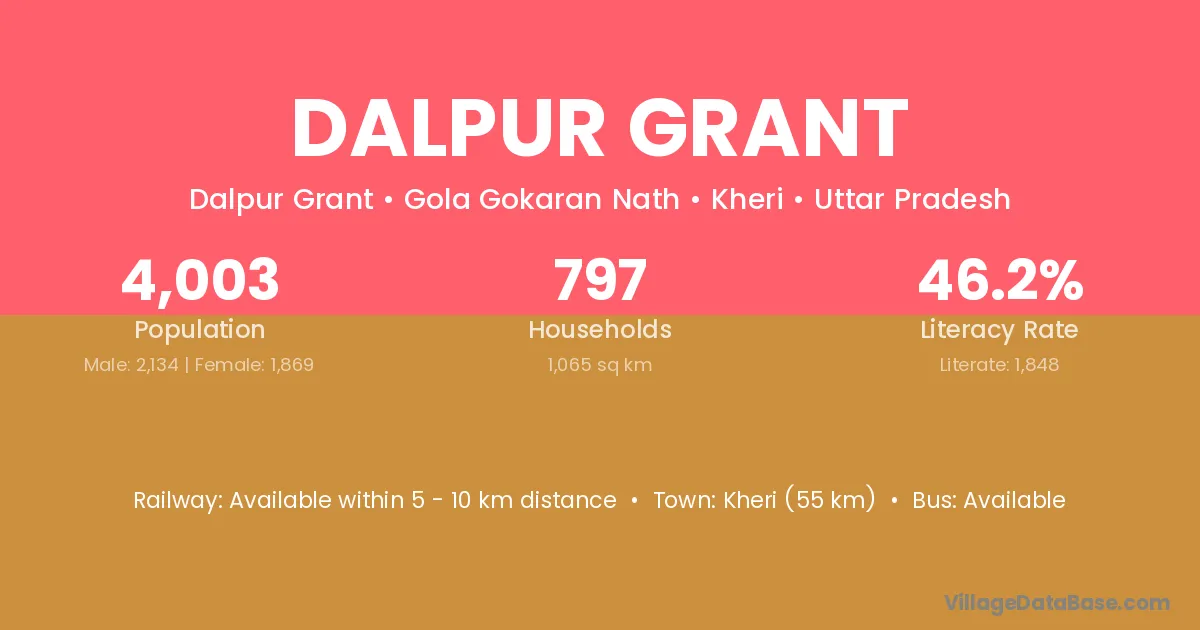 Kheri (55 km) is the nearest town to Dalpur Grant village for major economic activities and is located approximately 55 km away.