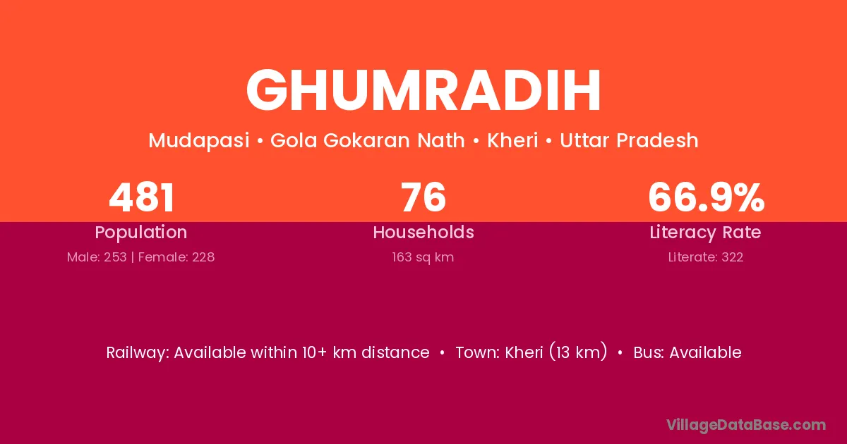 Kheri (13 km) is the nearest town to Ghumradih village for major economic activities and is located approximately 13 km away.
