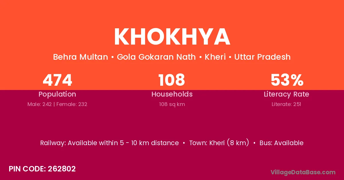 Khokhya village has a total population of 474 people, of which 242 are males and 232 are females.