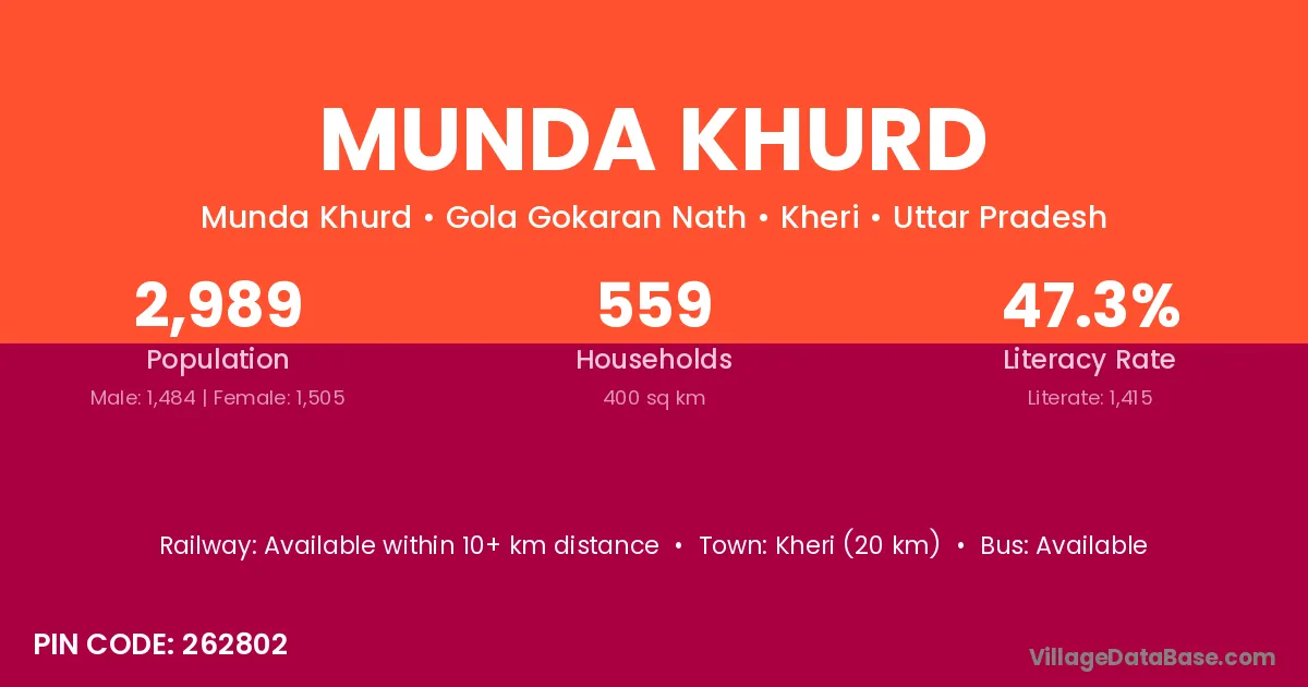 Kheri (20 km) is the nearest town to Munda Khurd village for major economic activities and is located approximately 20 km away.