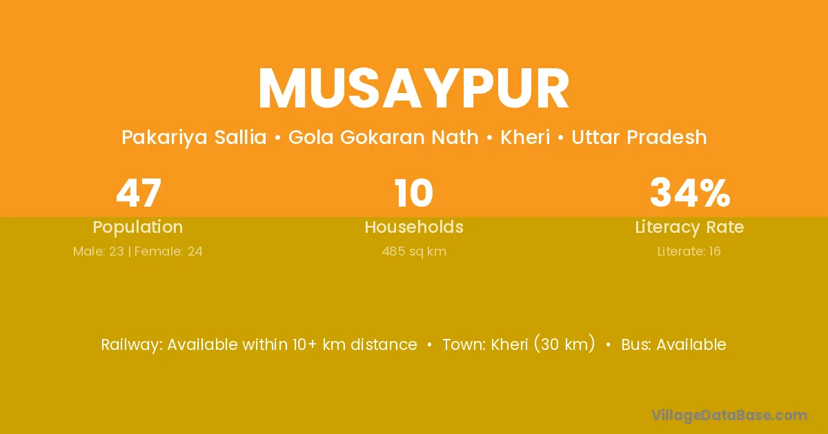 Musaypur village has a total population of 47 people, of which 23 are males and 24 are females.