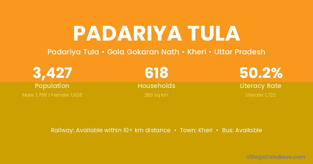 Padariya Tula village has a total population of 3,427 people, of which 1,799 are males and 1,628 are females.