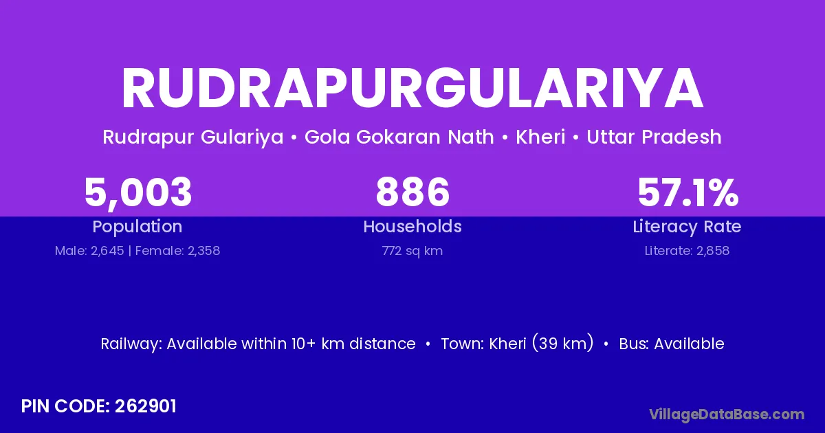 Kheri (39 km) is the nearest town to Rudrapurgulariya village for major economic activities and is located approximately 39 km away.