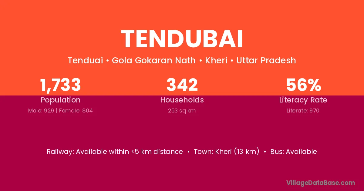 Tendubai village has a total population of 1,733 people, of which 929 are males and 804 are females.