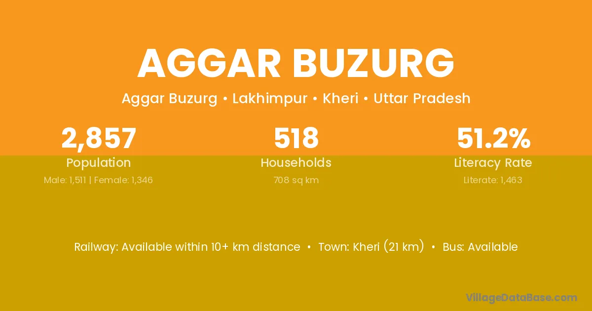 Kheri (21 km) is the nearest town to Aggar Buzurg village for major economic activities and is located approximately 21 km away.