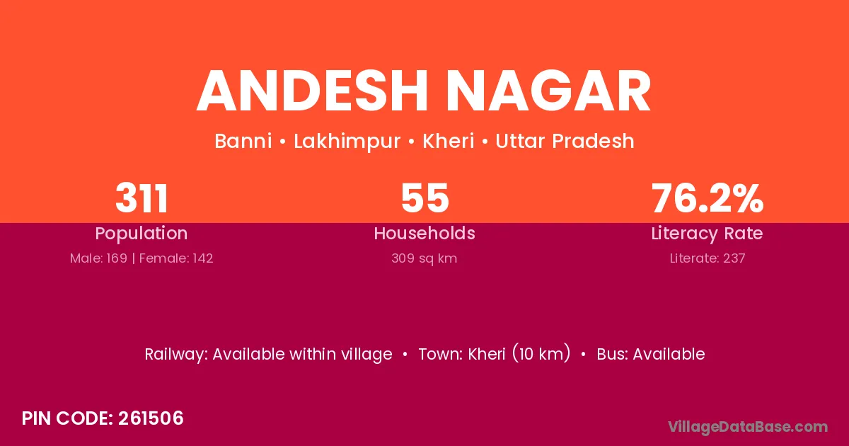 Kheri (10 km) is the nearest town to Andesh Nagar village for major economic activities and is located approximately 10 km away.